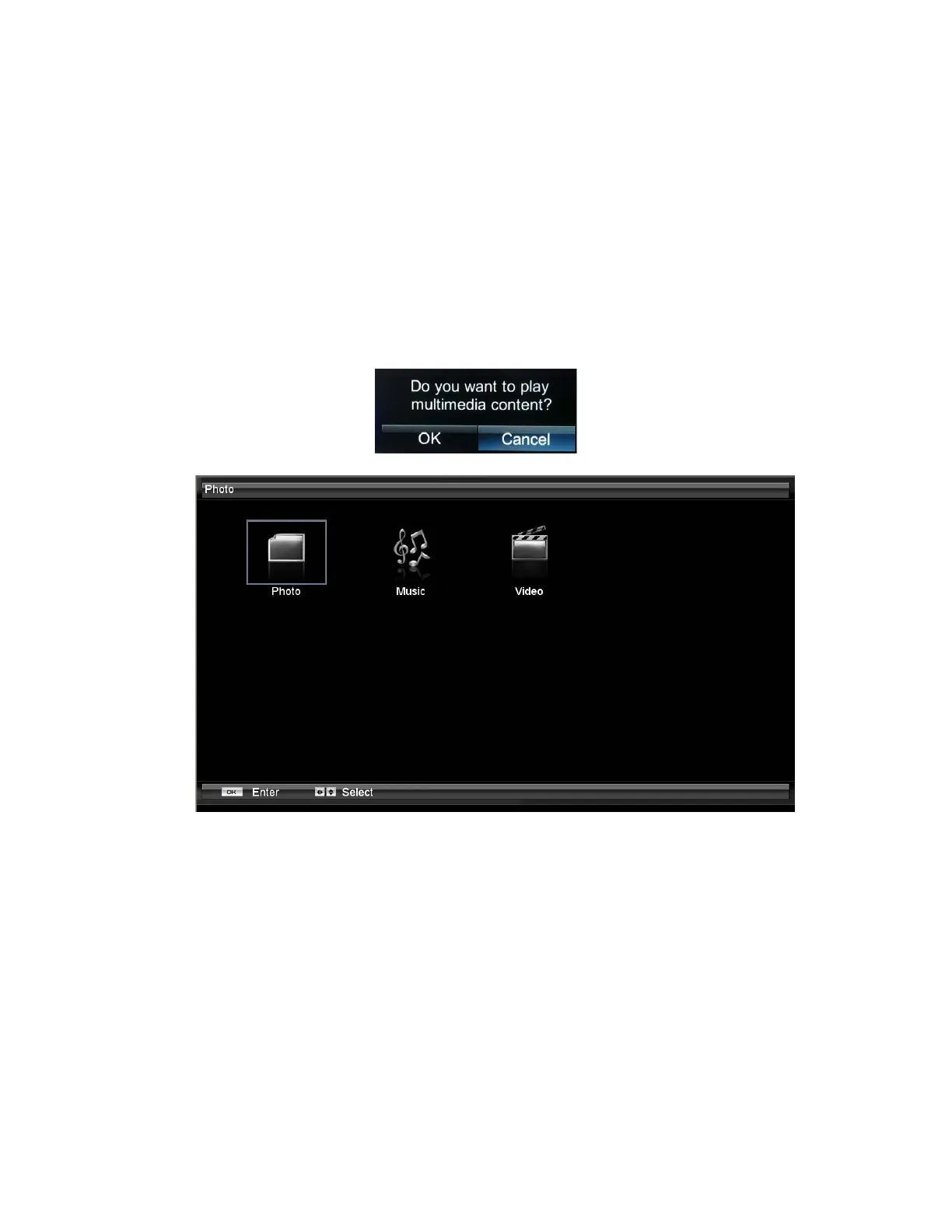 3. Press ◄ or ► to highlight Photo, Music, or Video and the press OK to select it. A menu will be