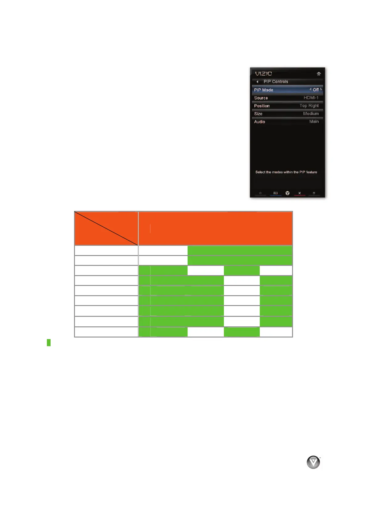 Select from Off, PIP (Picture-inside-picture) or POP (Picture-