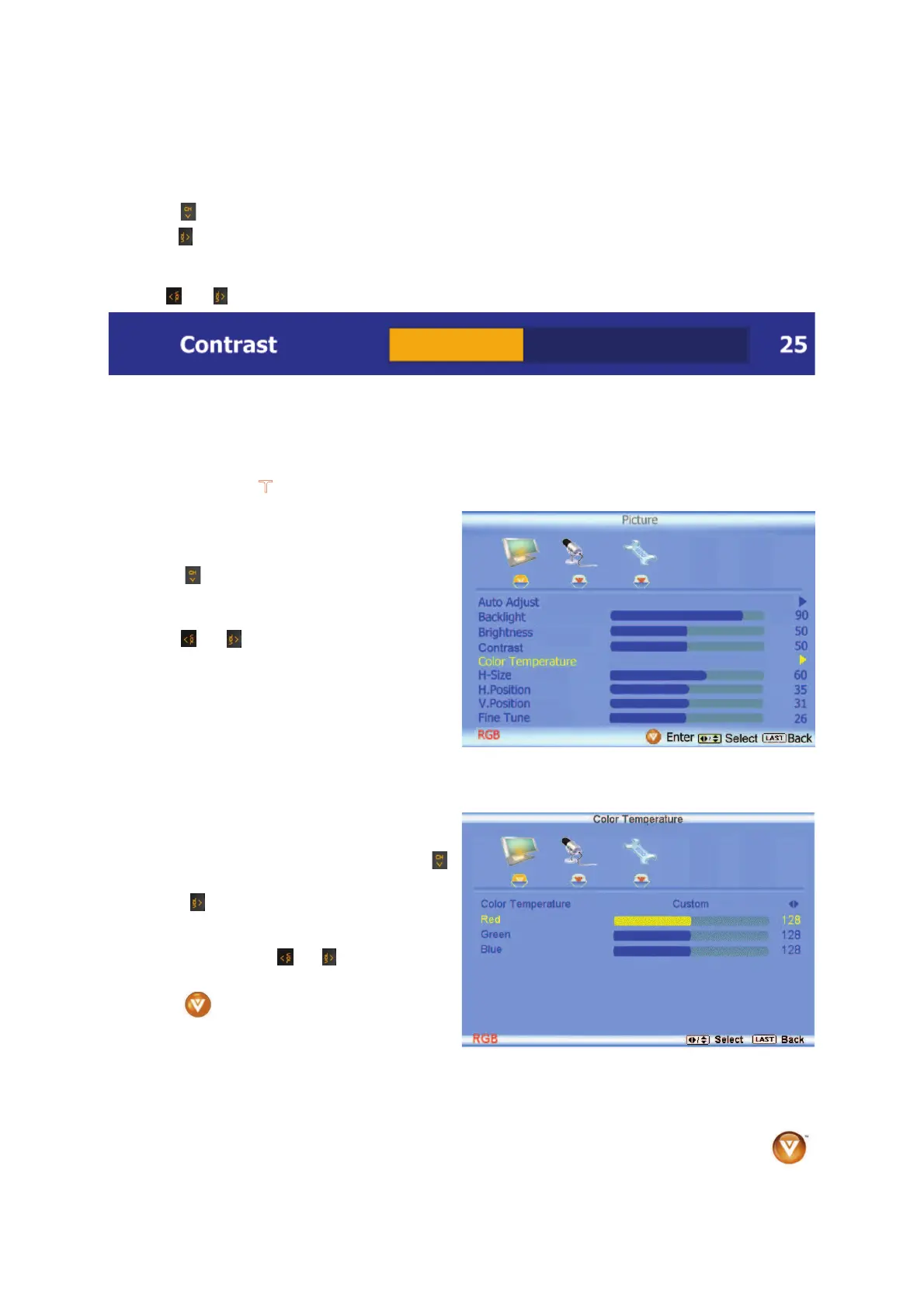 button to start adjusting the contrast and the menu page will disappear and be replaced by