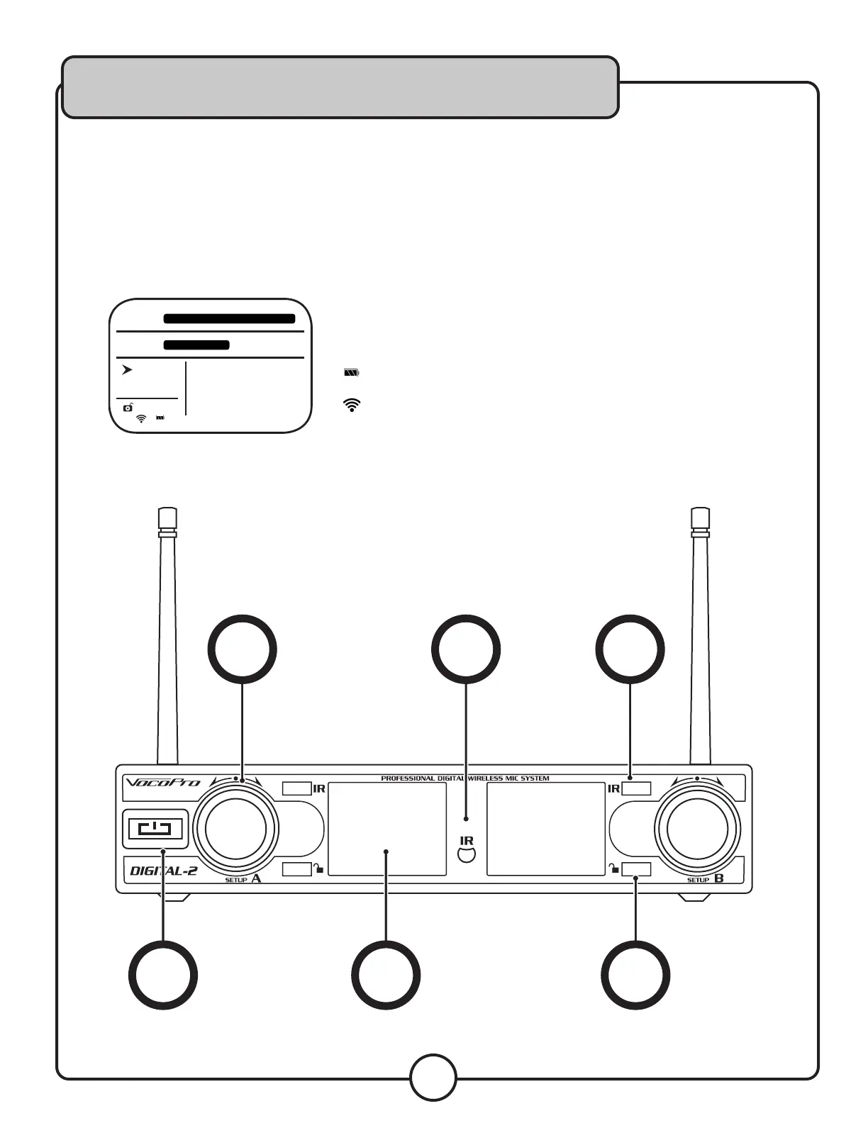 5. Display – This shows current frequency, mic battery level, graphic frequency analyzer, and