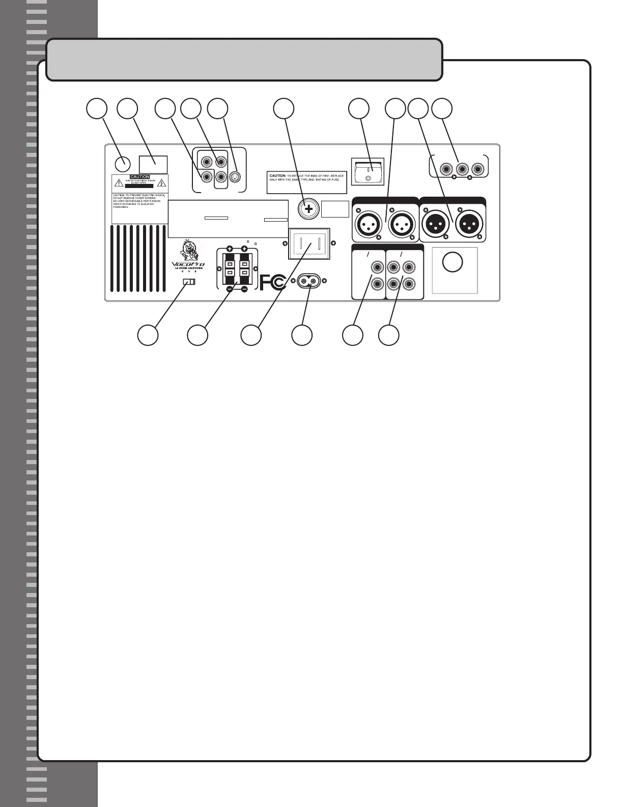 14. AC~IN terminal - Connect AC MAIN POWER CORD from the wall outlet to this terminal.