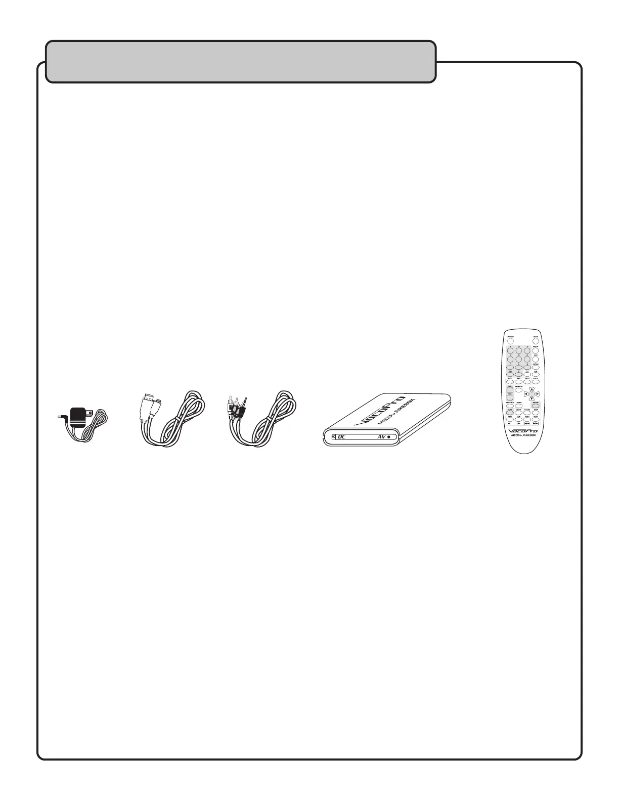 1 DC power adaptor 1 USB 2.0 Cable 1 A/V Patch Cable 1 MEDIA-JUKEBOX 1 Remote Control with 2 AAA batteries