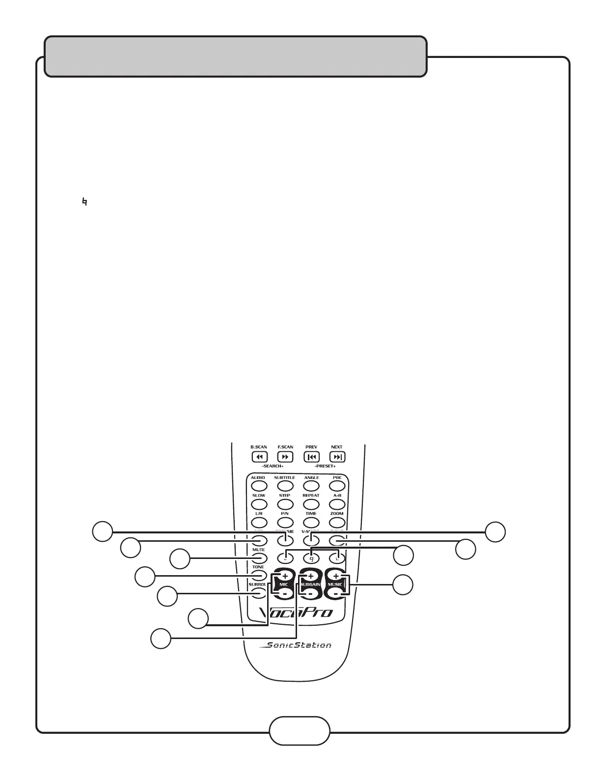 37. Mic + and -- Master Volume buttons - Adjusts the master microphone vocals volume. Press + to raise the