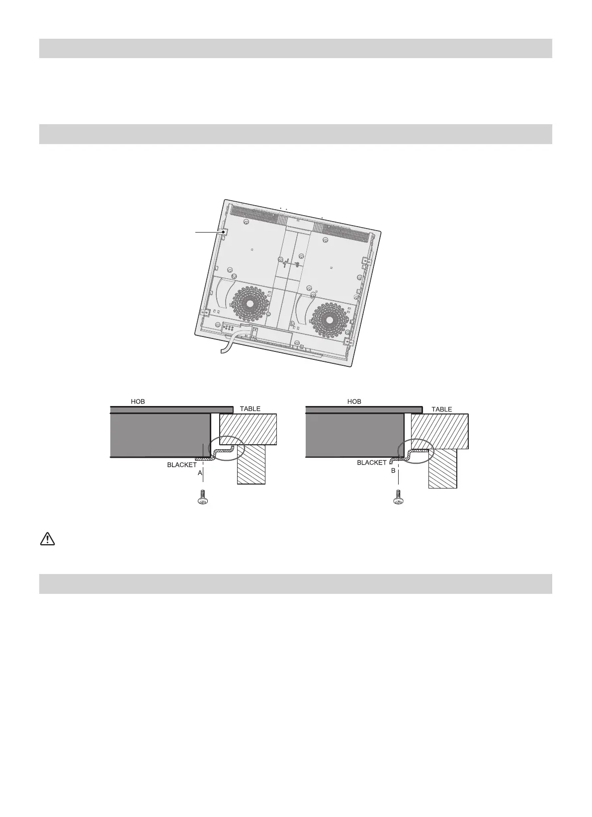 • Fix the hob on the work surface by screw brackets on the bottom of hob(see picture) after installa-