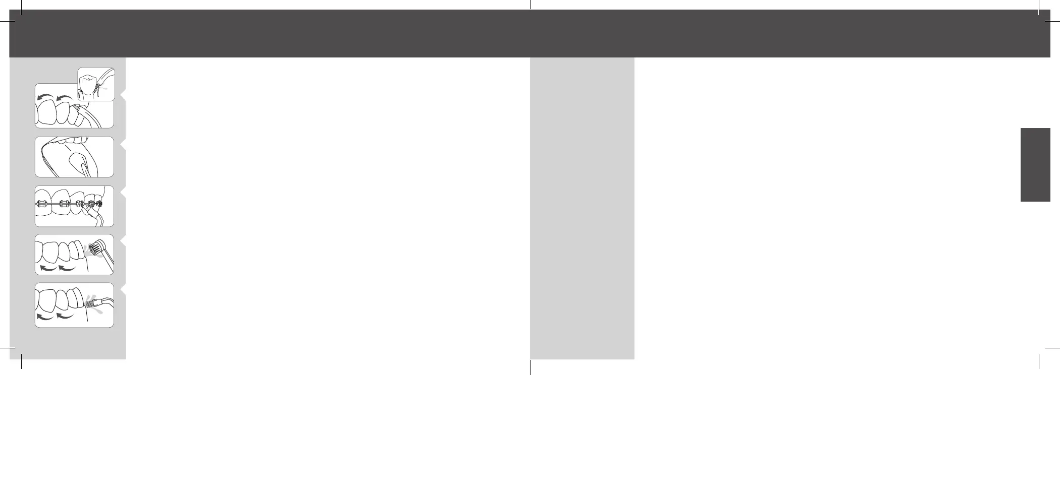 contact avec la dent. Suivez la ligne gingivale et marquez une brève pause entre les dents pour brosser en douceur et permettre à l’eau