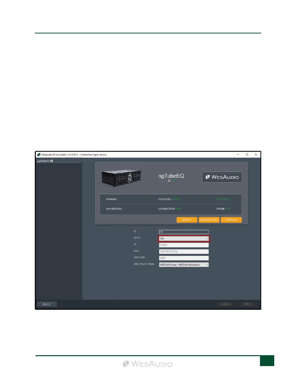 To toggle the DHCP setting on your ngTubeComp unit to either enabled or disabled, follow these steps: