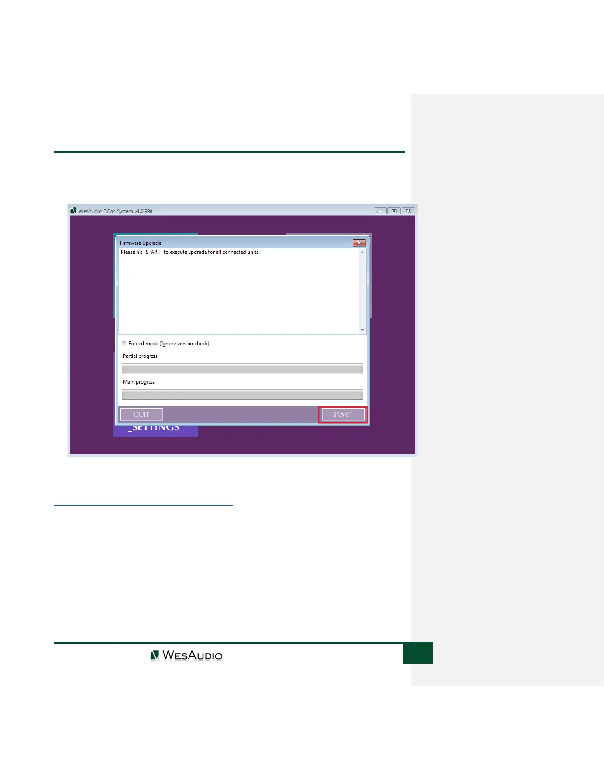 To perform firmware upgrade, go to GConManager upgrade application and hit “Start” button.