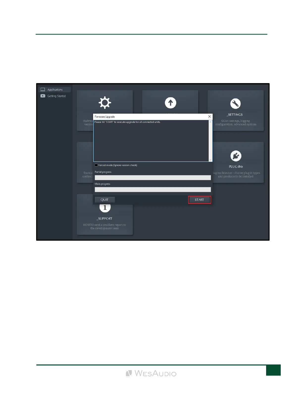 To update the firmware, navigate to the GConManager UPGRADE section and press the “Start”