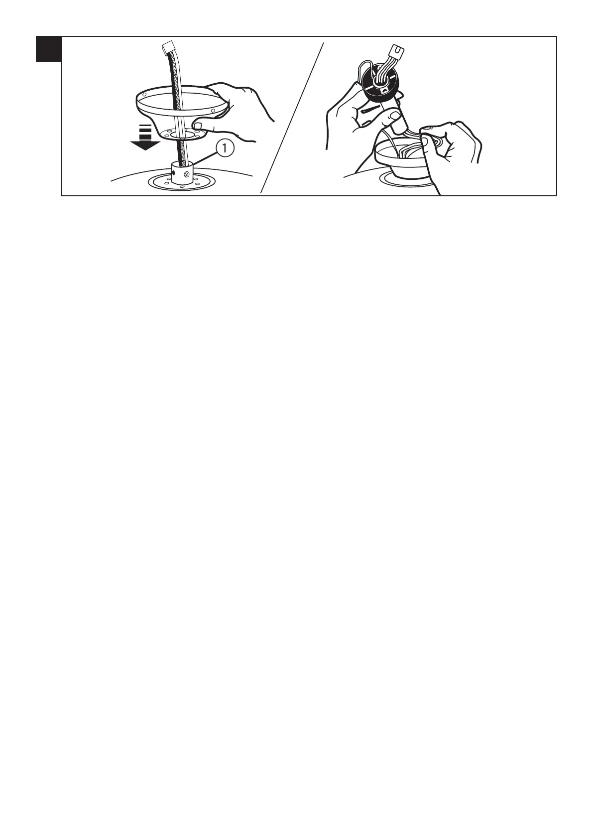 Laske kupu moottorikokonaisuuden johtojen, pistokkeen ja kehyksen (1) päälle. Kuljeta johdot ja pistoke tangon ja pallon läpi.