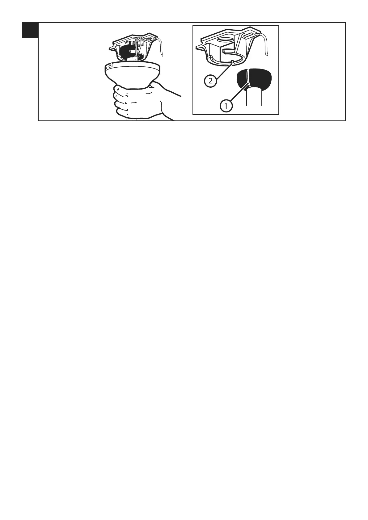 Previdno privzdignite sklop ventilatorja na stropno plošèo. Obraèajte ventilator toliko èasa, dokler se zareza na krogli (1) ne zaskoèi v grebenu (2) na stropni plošèi. S
