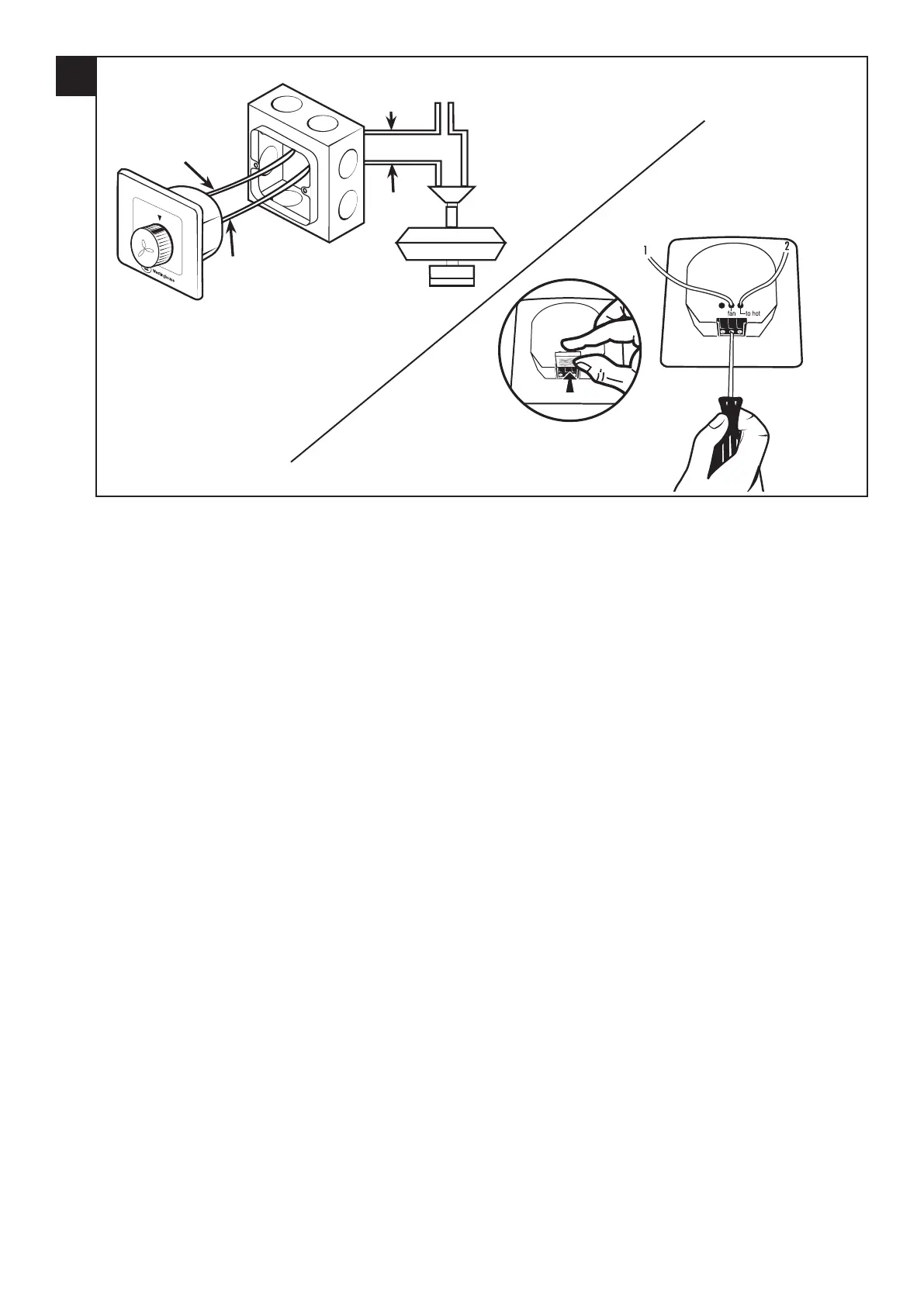 Connect the fan control wire from the fan, to the terminal marked “TO FAN” on the back of the wall control unit (1). Connect the 230V AC hot house