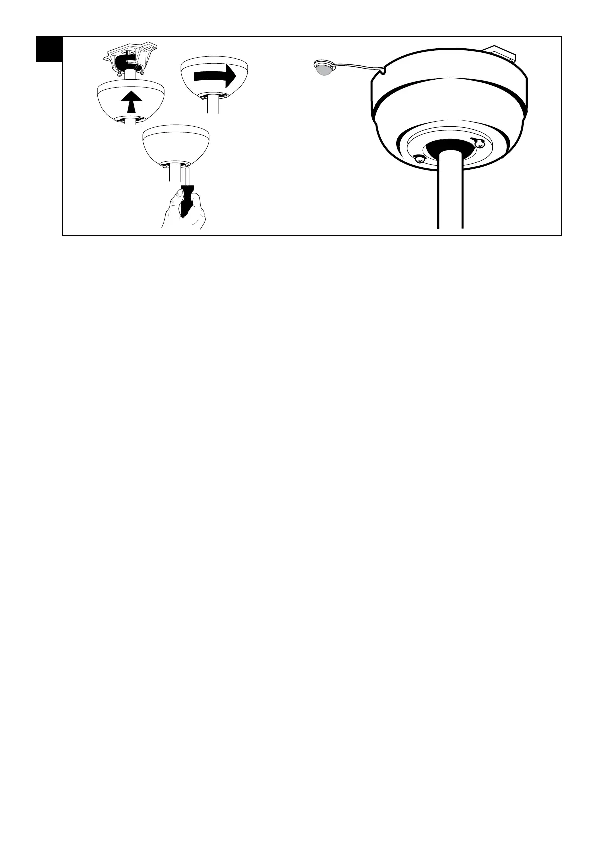 plafondkap uit met de 2 schroeven op de onderkant van de montagebeugel. Draai de plafondkap om de spiegaten door de uitstekende schroeven te laten grijpen.