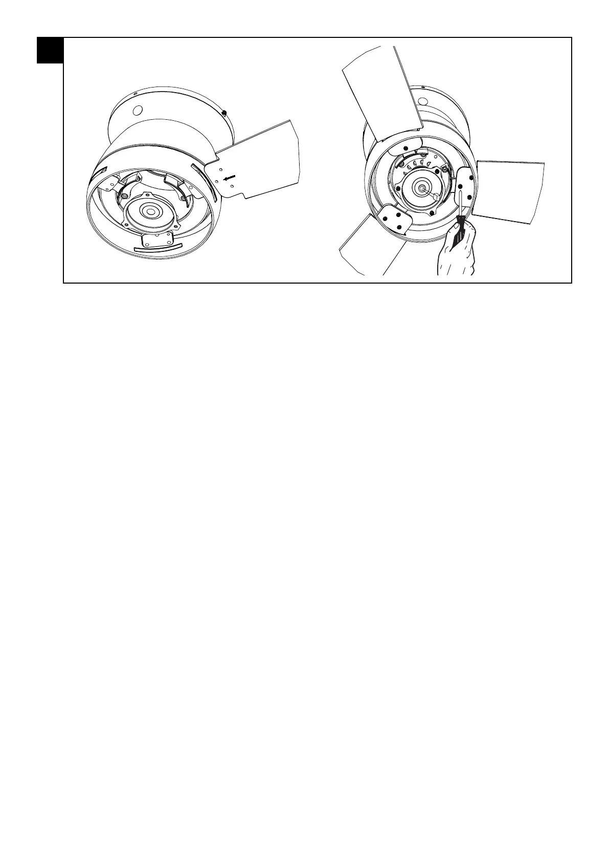 Insert the blades through the slots on the motor housing as shown, and use the provided blade screws to tighten the blades to the pre-attached blade brackets.