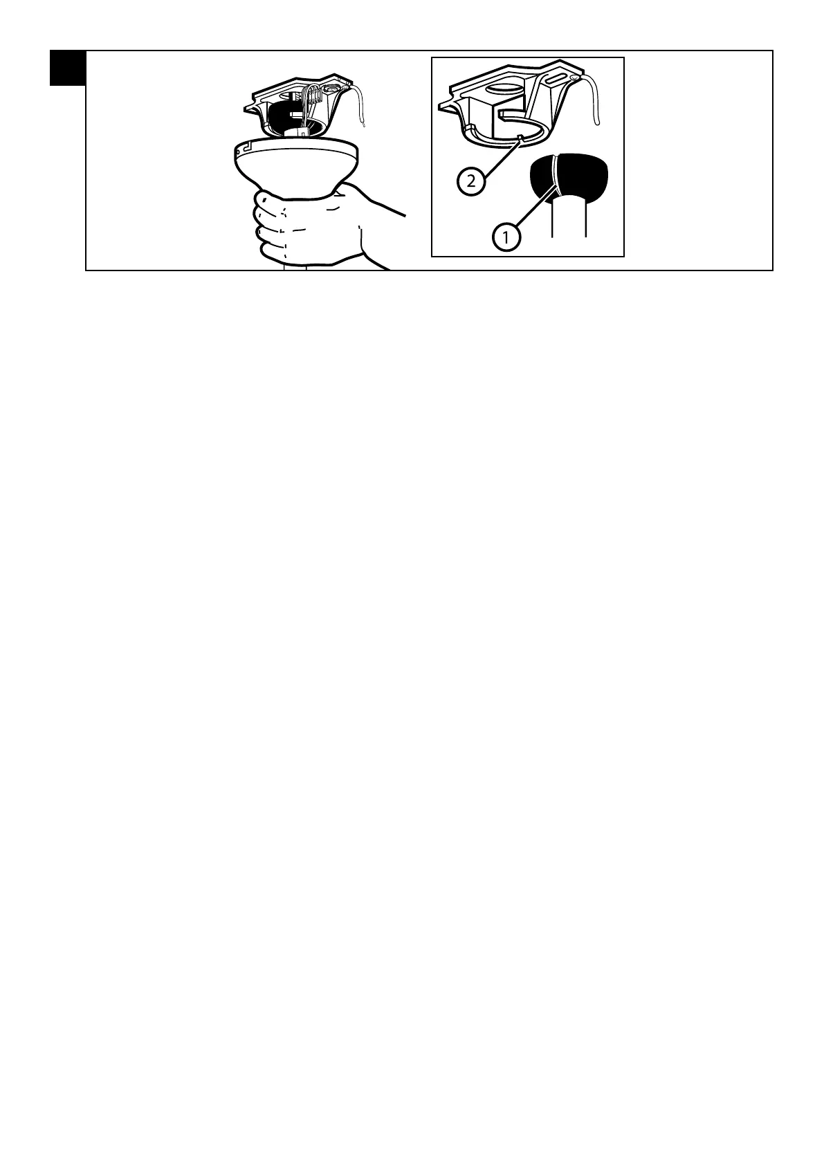 Previdno privzdignite sklop ventilatorja na stropno plošèo. Obraèajte ventilator toliko èasa, dokler se zareza na krogli (1) ne zaskoèi v grebenu (2) na stropni plošèi.