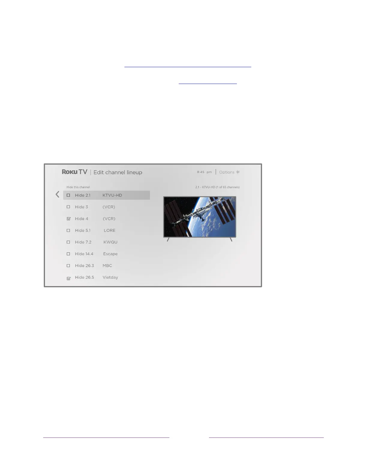 To edit the channel lineup, from the Home screen menu, navigate to Settings > TV