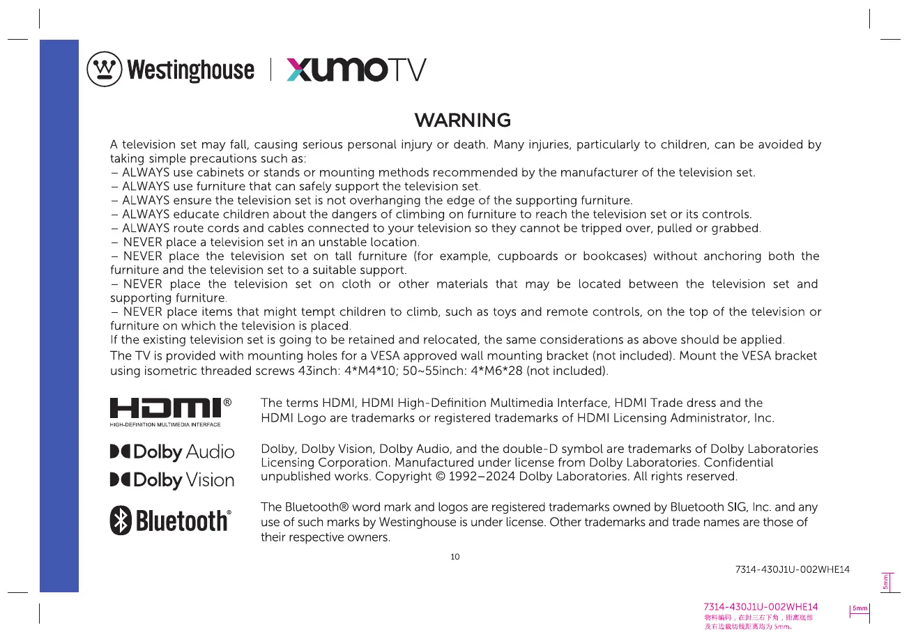 Bekijk gratis de handleiding van Westinghouse WX50UA4800, stel vragen en lees de antwoorden op veelvoorkomende problemen, of gebruik onze assistent om sneller informatie in de handleiding te vinden of uitleg te krijgen over specifieke functies.