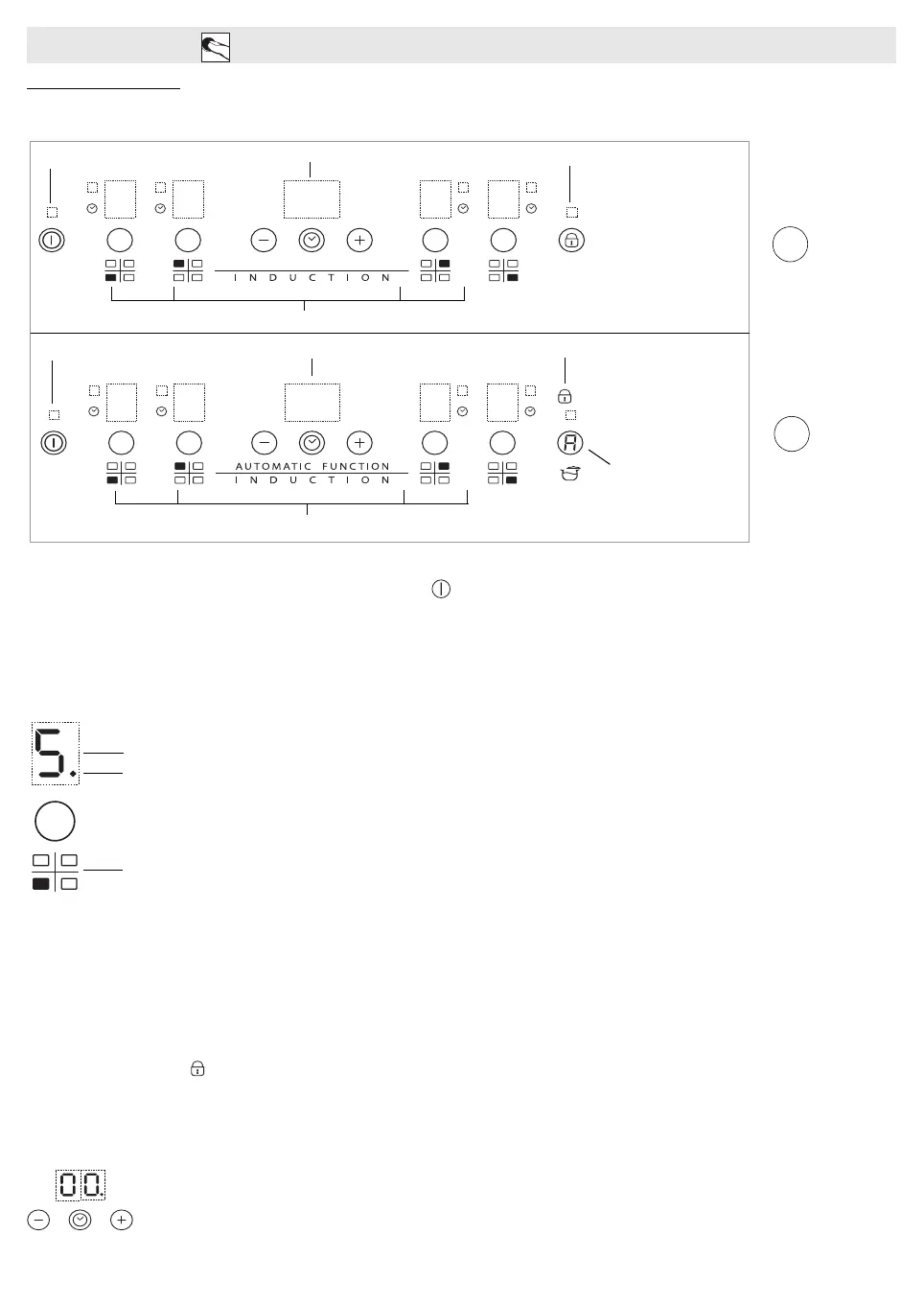 Keittotaso kytketään toimintaan painamalla noin 2 sekunnin ajan painiketta , kunnes keittoalueiden näytöt syttyvät. Se kytketään pois toiminnasta koskemalla