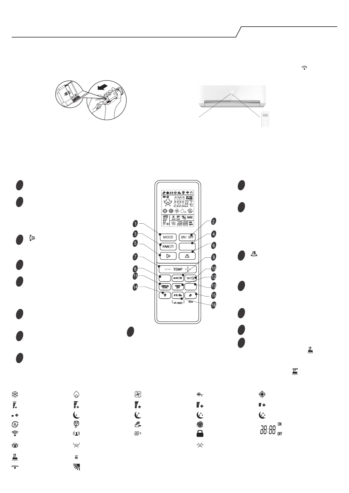 Spia di rareddamento Spia di deumidicazione Spia di solo ventilatore Spia riscaldamento a 8°C Spia di riscaldamento