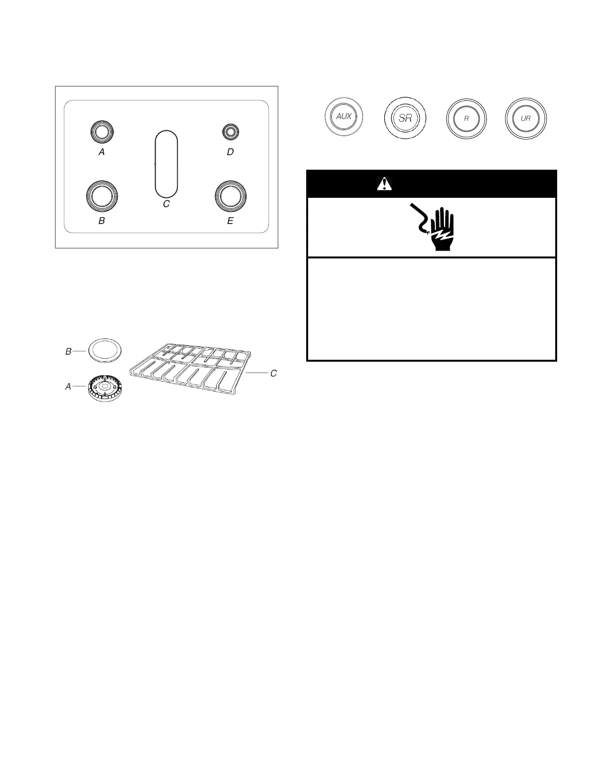 base. Each round burner cap is marked with an AUX, SR, UR,