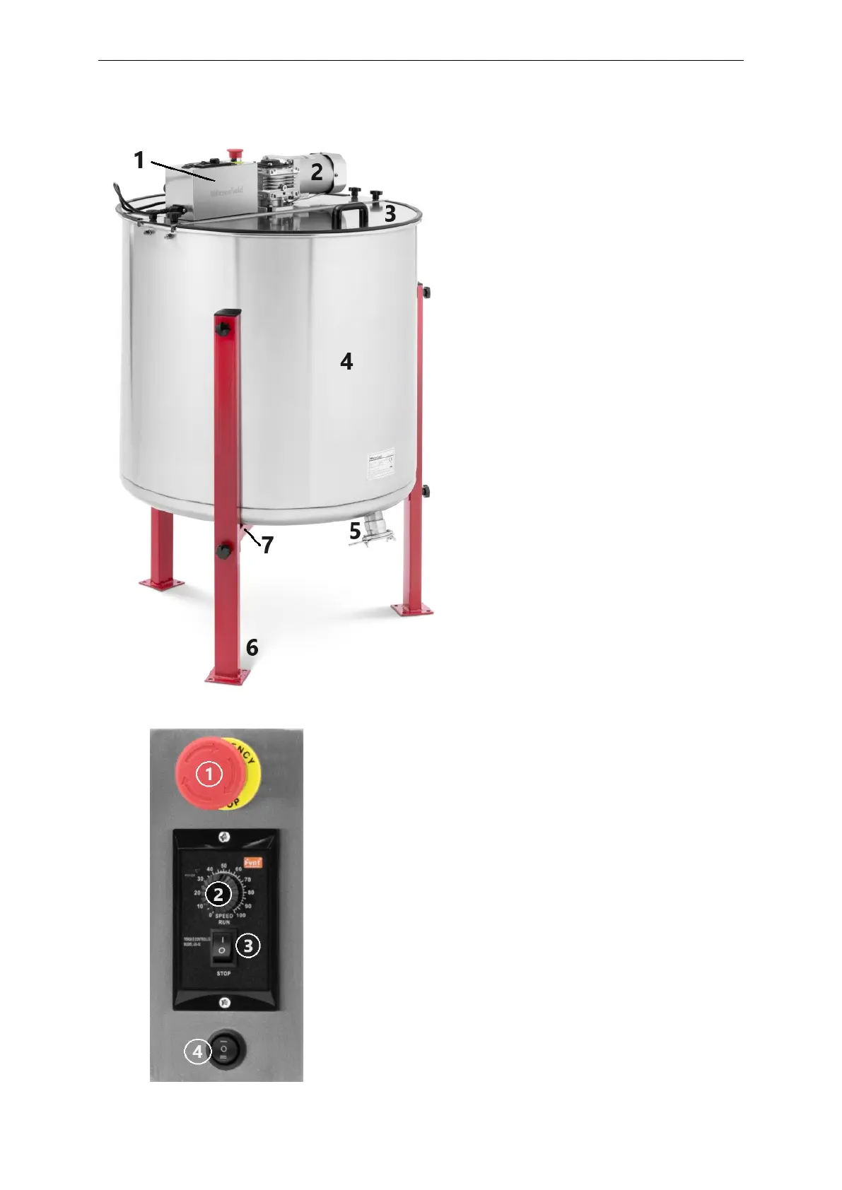1 – Nødstopp. Når knappen trykkes, kobles strømmen fra og