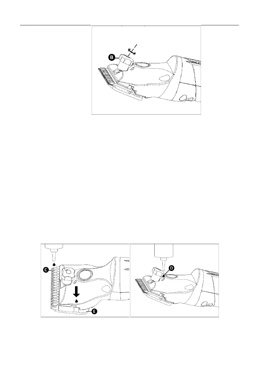 muss eine dünne Ölschicht auf die Schermesser (C) den Unterkamm (E)