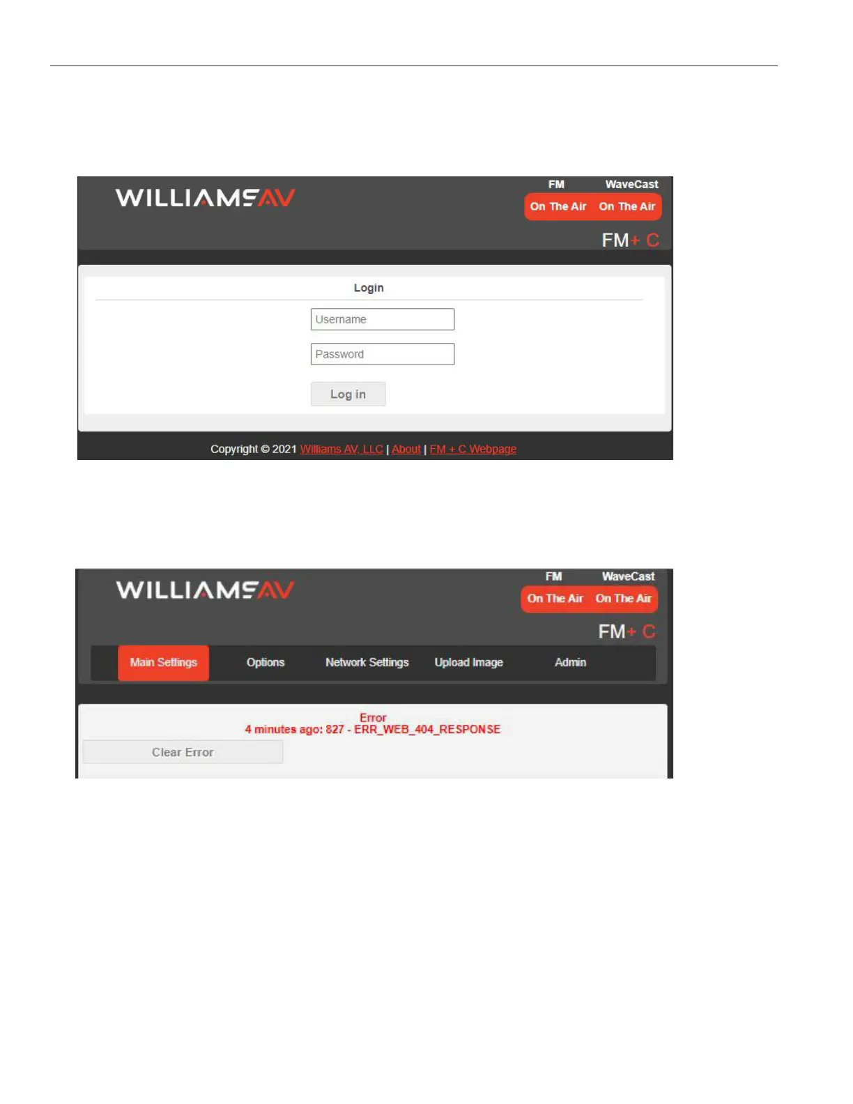 If the FM+ encounters an error, a message may appear at the top of the screen. Clicking the Clear Error button