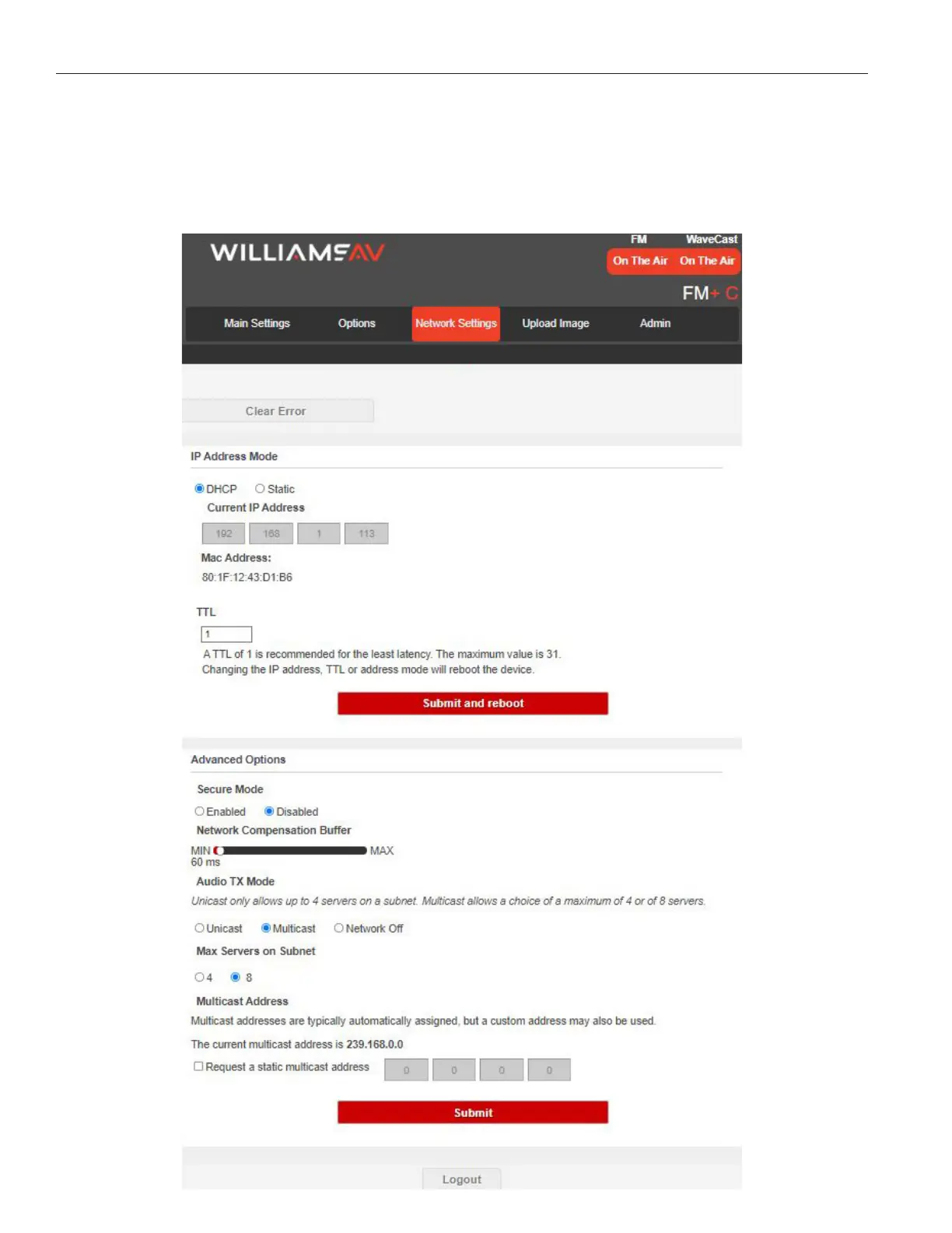 The Network Settings page displays the current network configuration of the unit. Typically these are not