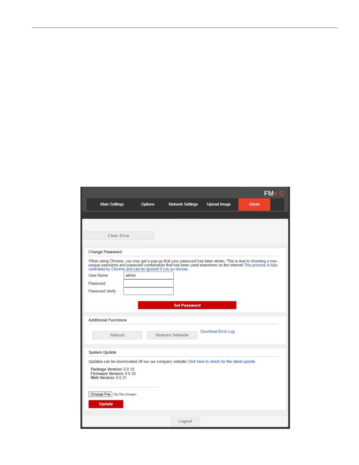 The Admin page displays administrative controls that can be used to help with non-technical FM+ C users, or for