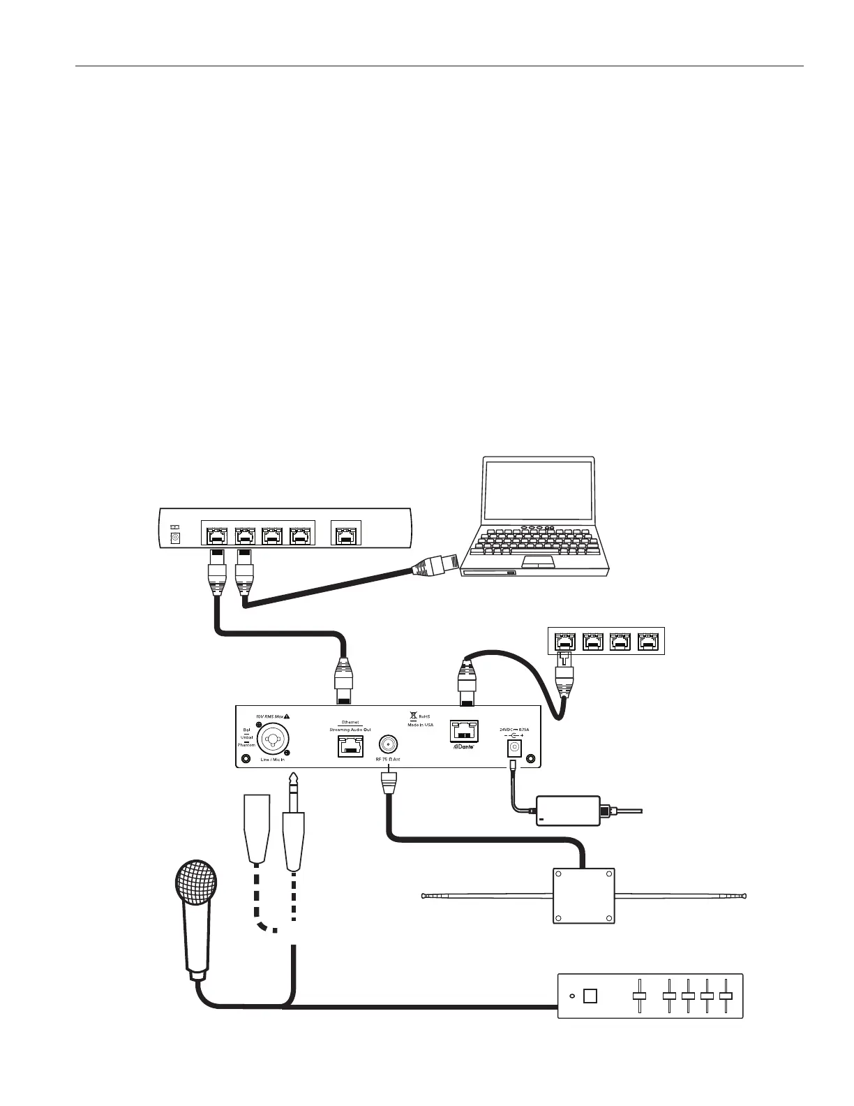 The Ethernet and Dante RJ-45 jacks can be used to connect the FM+ C to either a local network or directly to a