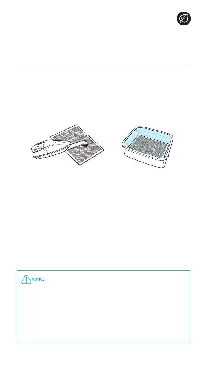 Reinig het voorfilter met een stofzuiger of zachte borstel. Is het filter