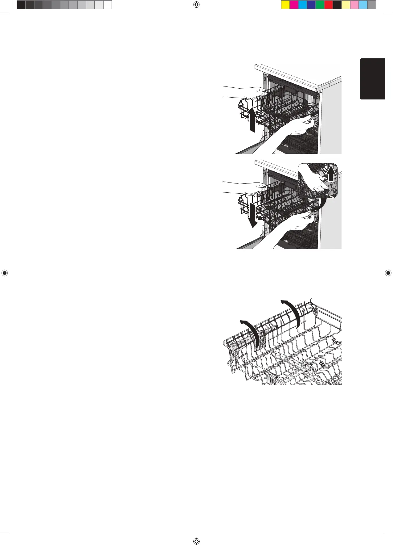 De rekken in de bovenkorf kunnen opgeklapt worden om ruimte te maken voor hoge glazen.