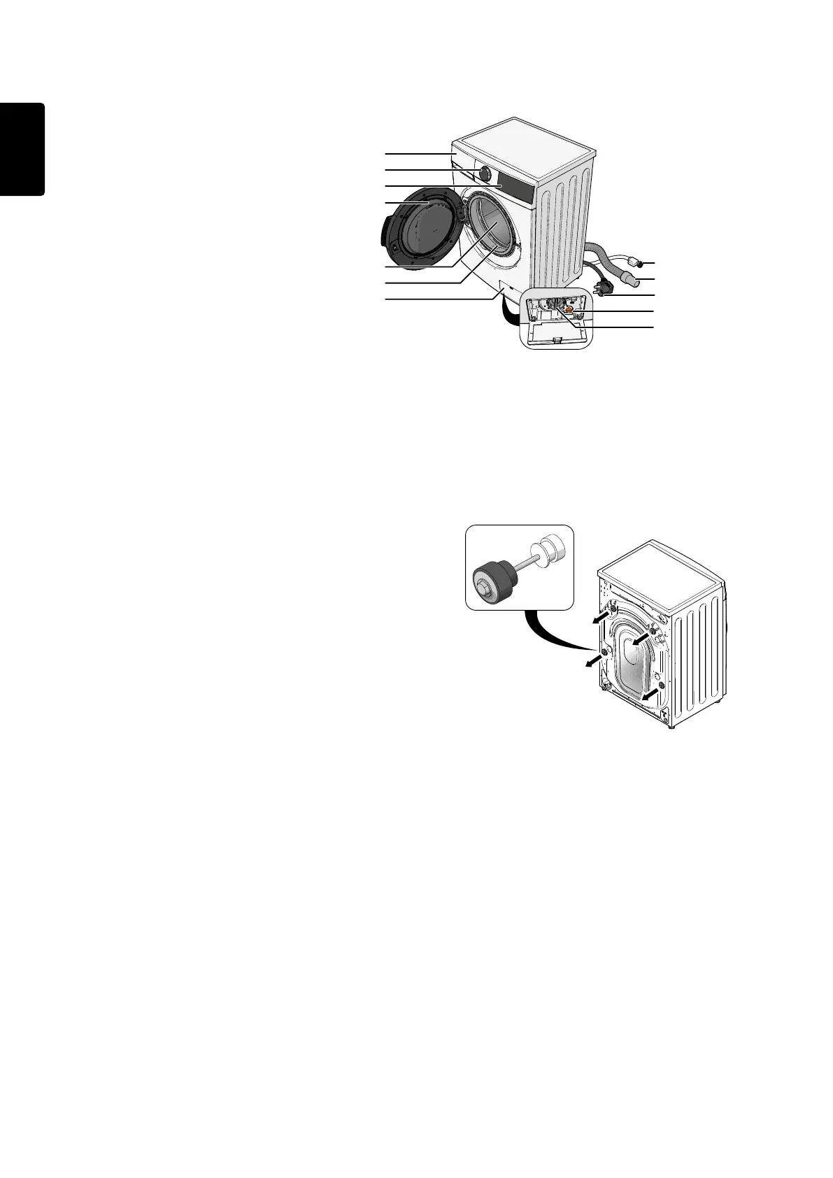 1. Leg de wasmachine neer op de vloer. Gebruik ter bescherming zacht materiaal zoals schuim of kleding tussen de