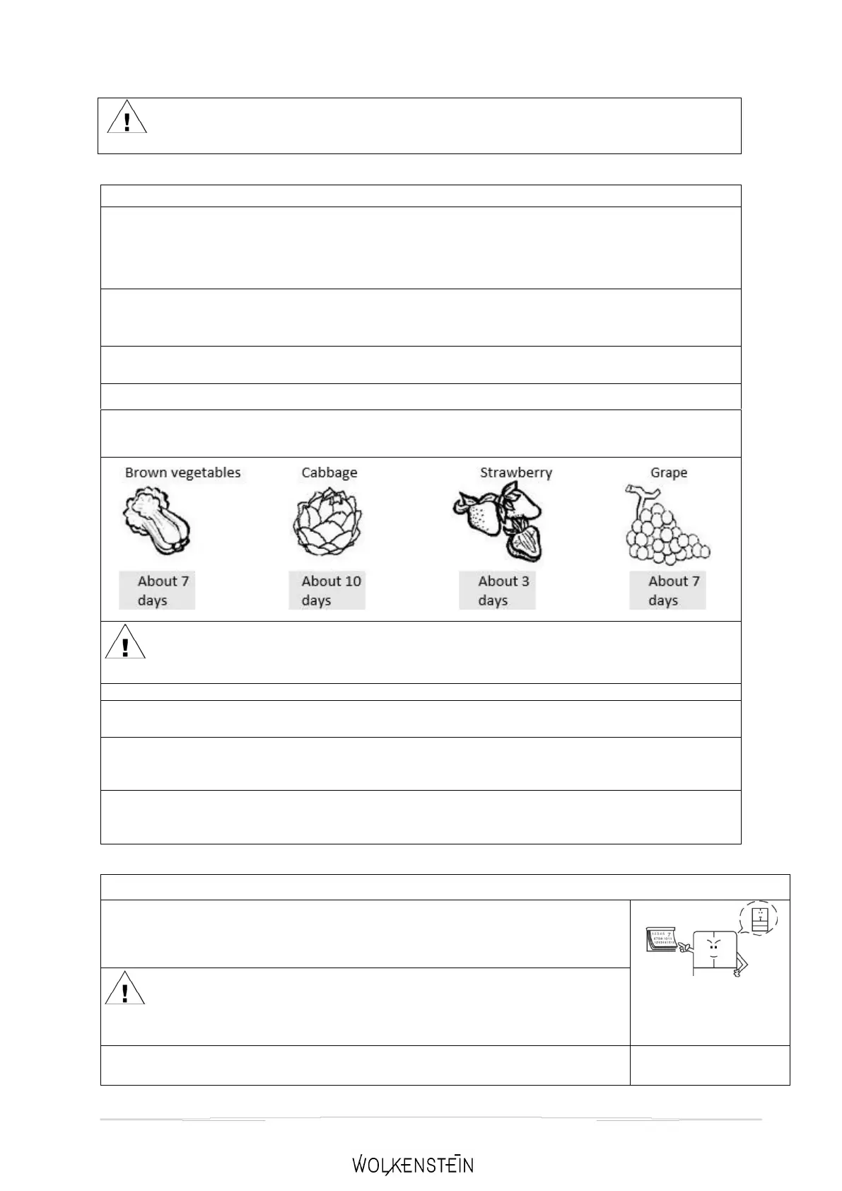 In case of manual defrosting, maintenance or cleaning, the temperature rise of frozen foods may shorten their