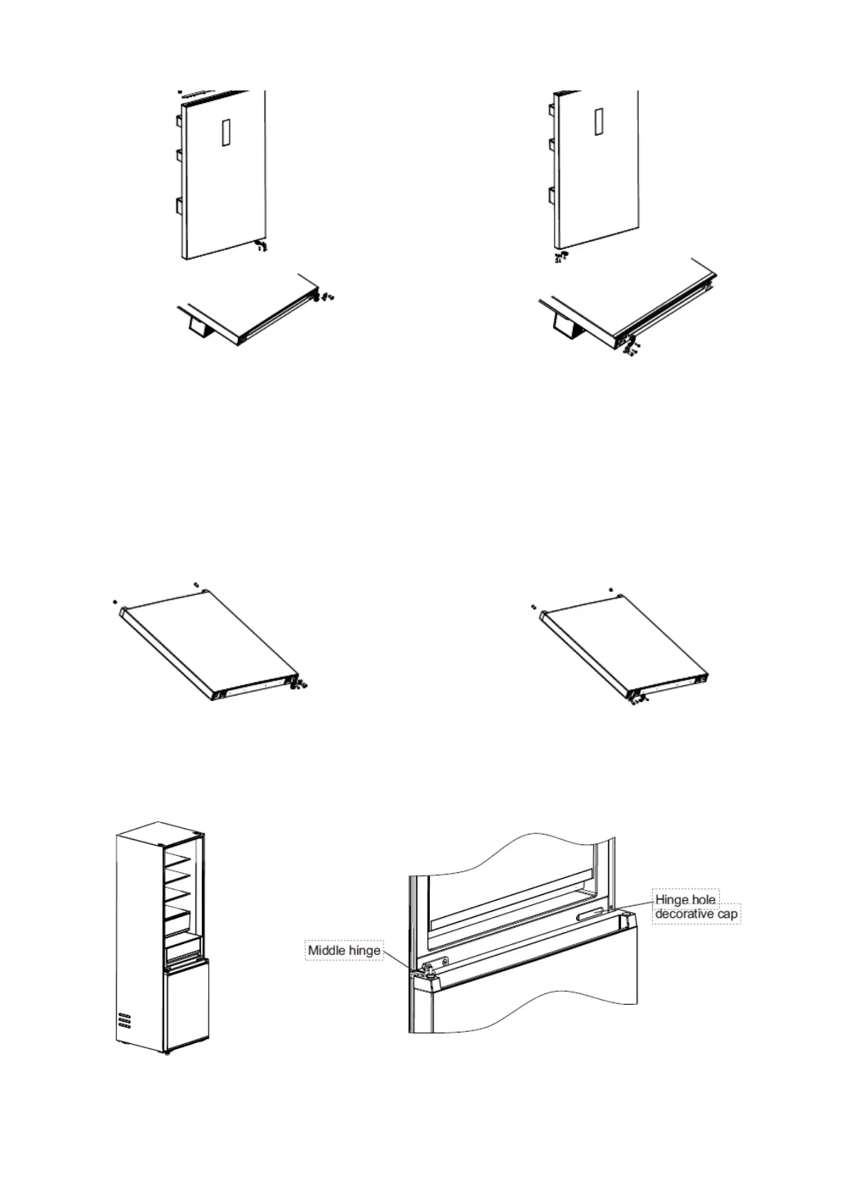7) Install the replaced refrigeration door on the lower hinge, then install the middle