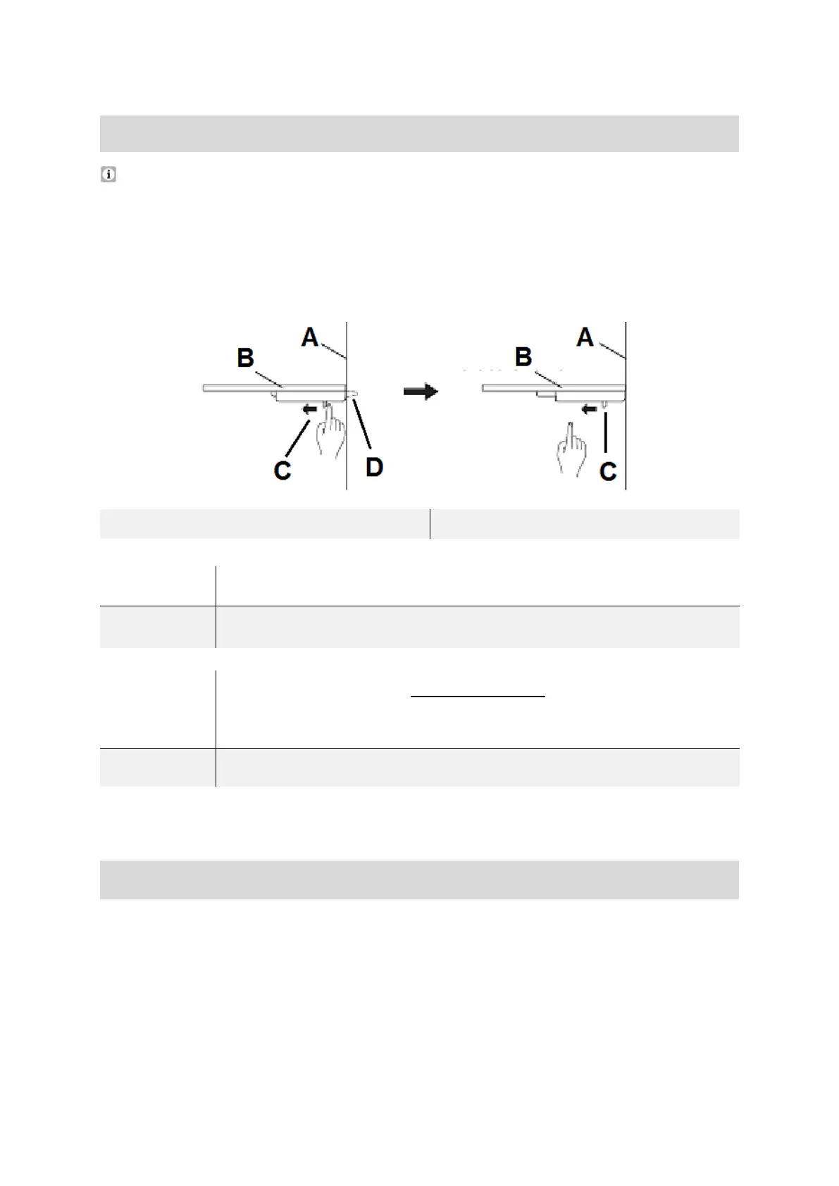 1. To open the latches of a glass shelf, push the right locking slider of the glass