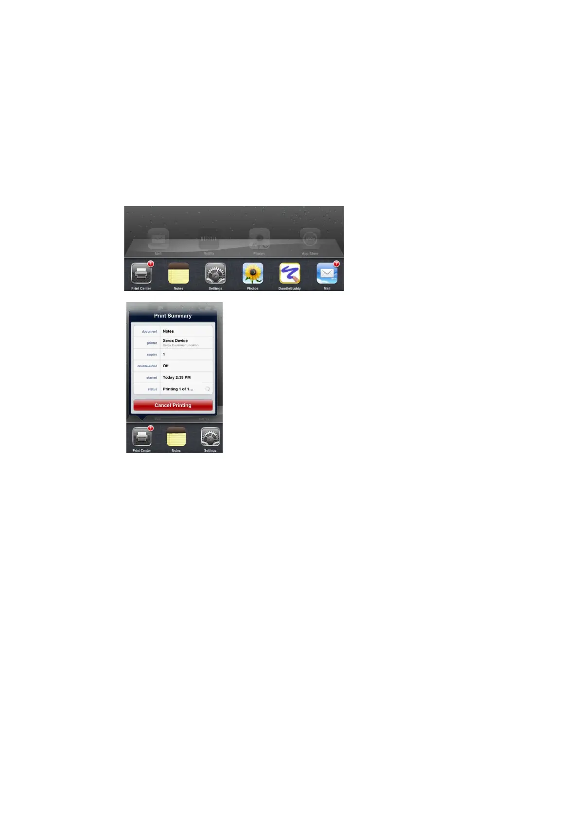 – To cancel a print job from your Apple device queue, select the Cancel Printing
