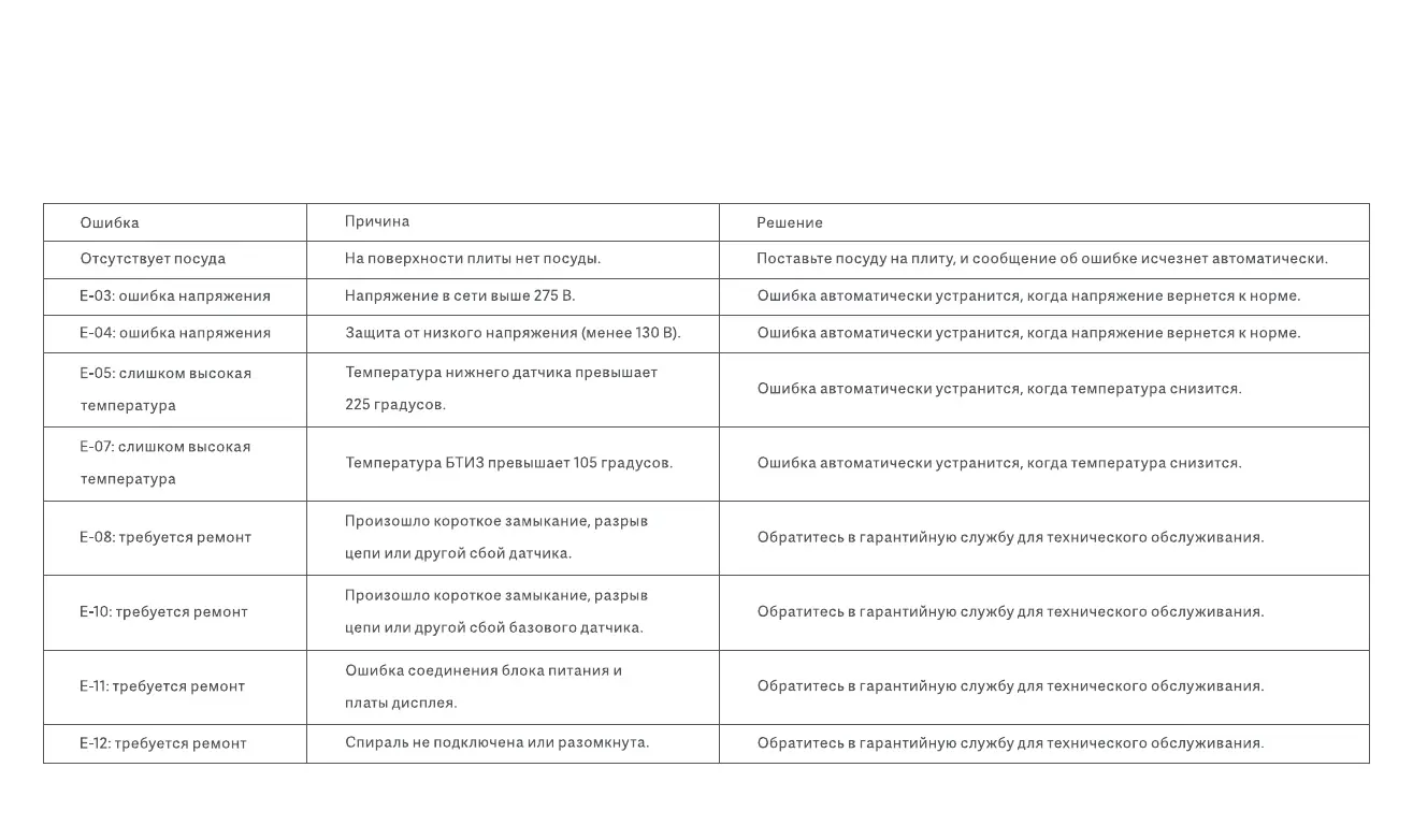 Если устройство не работает должным образом, на OLEDисплее будет показан код ошибки. Воспользуйтесь приведенной ниже таблицей, чтобы определить ошибку и устранить
