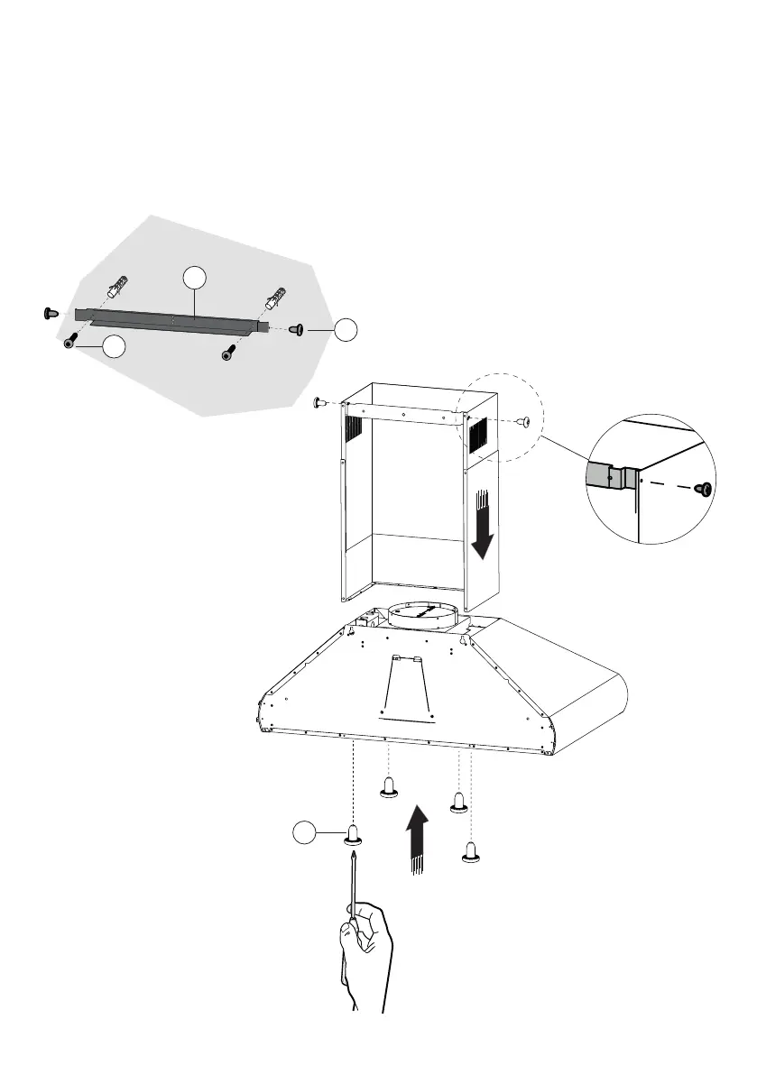 - Fije las chimeneas decorativas a la campana con los tornillos G.