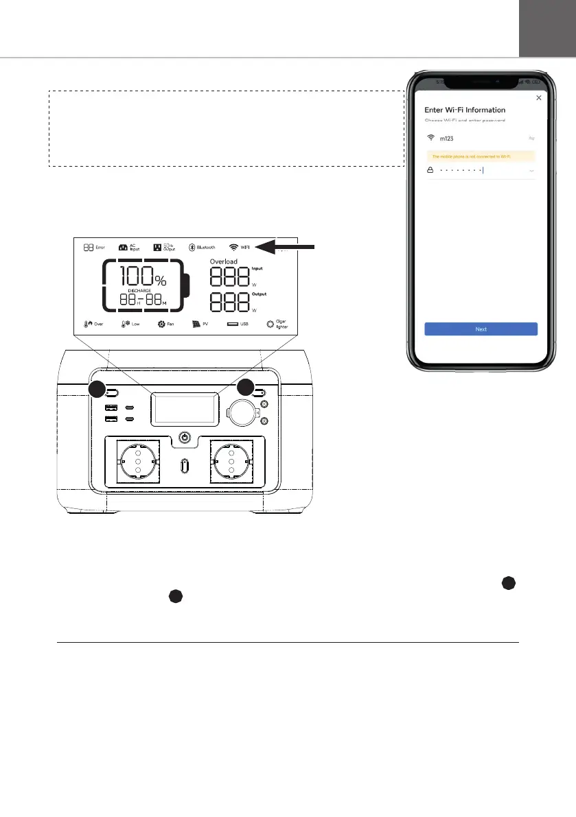 og DC-utgangsknappen 5 . Wi-Fi-ikonet begynner å blinke for å indikere en vellykket tilbakestilling.