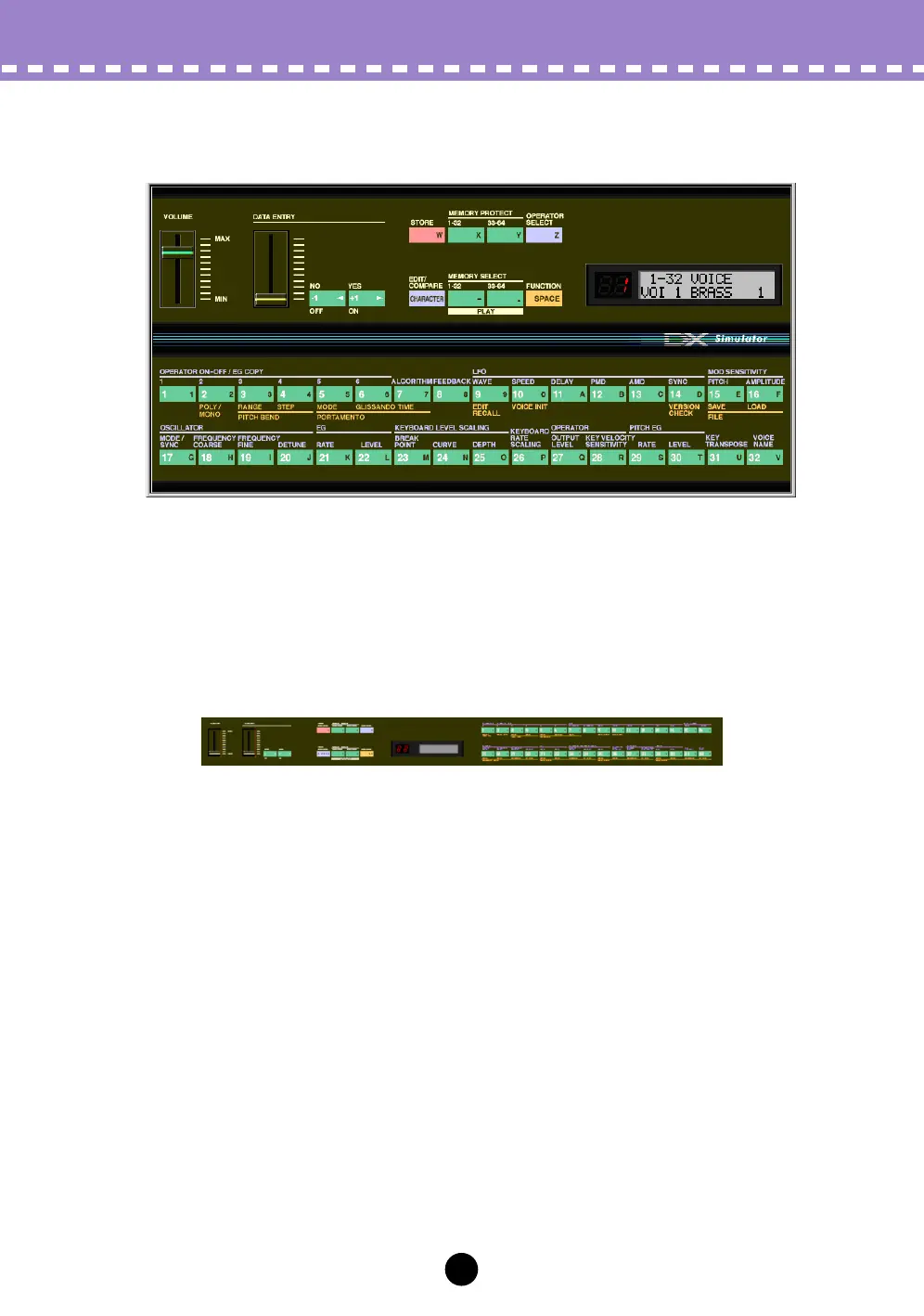 This window provides a “virtual” DX7 panel, and lets you edit the voices much as