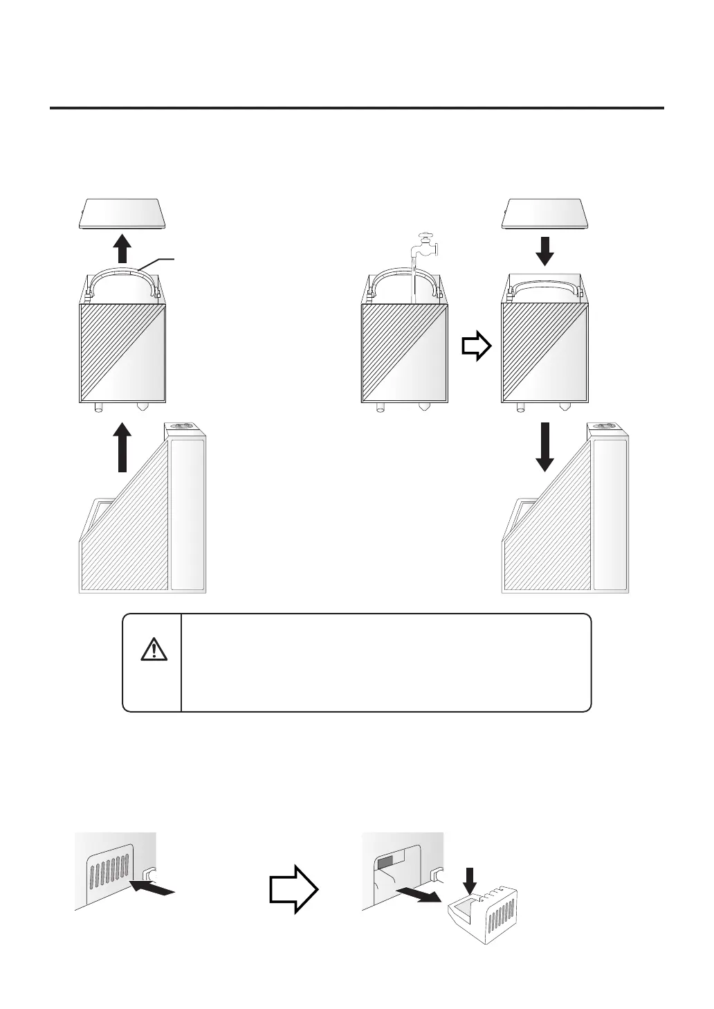 ①水タンクとふたを外す ②水タンクに水を入れて本体にセットし、ふたをする