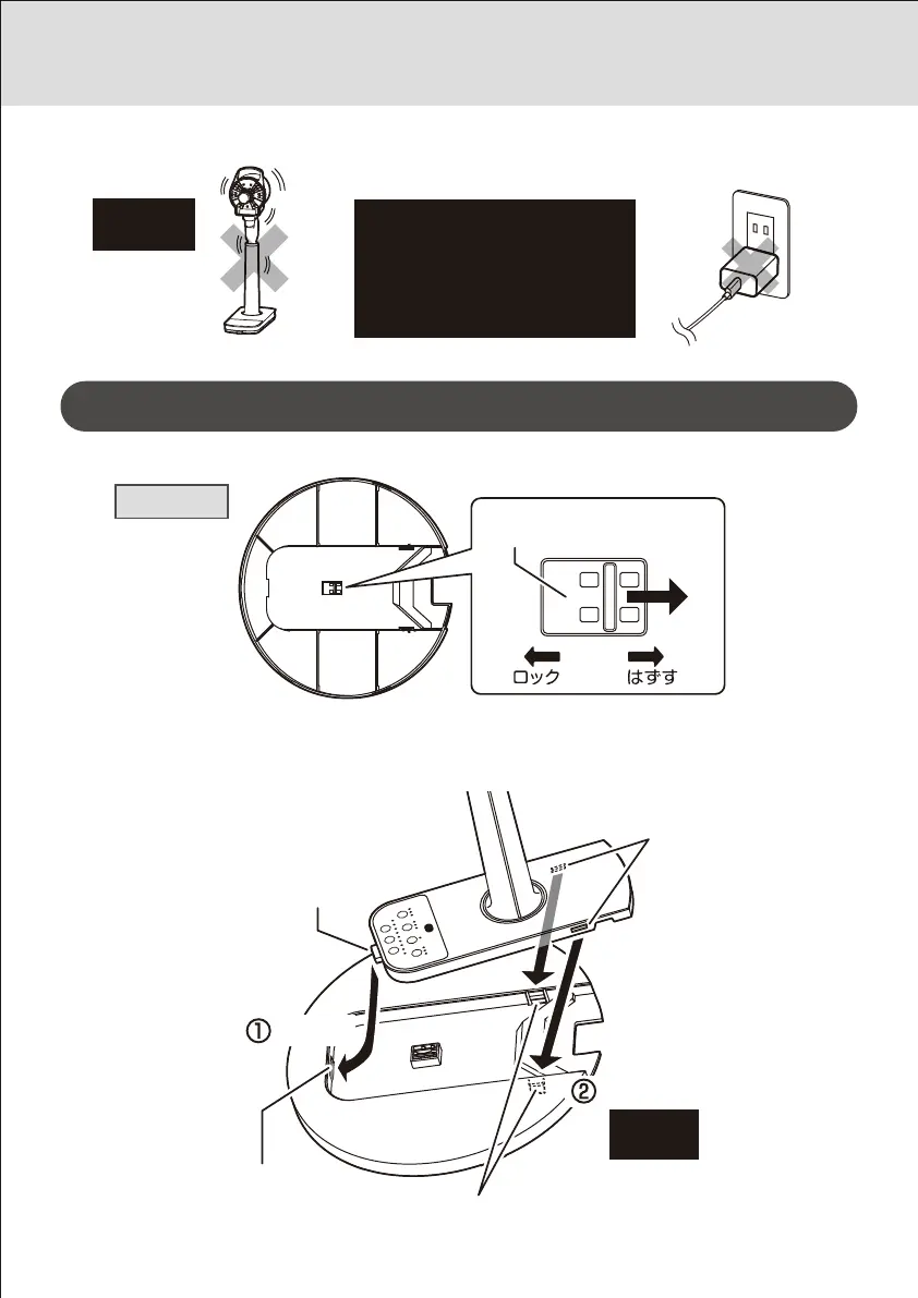 ❶ベース底面のスライドロックを「はずす」側へスライドさせます。