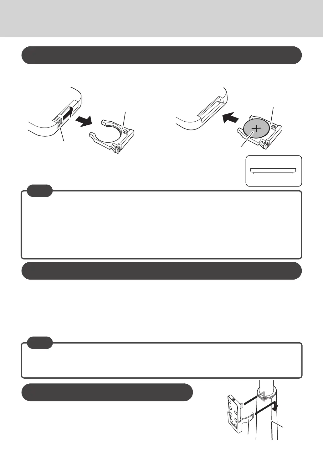 電池の+側を上にして電池ホルダーにのせ、電池ホルダーをリモコンに差し込みます。