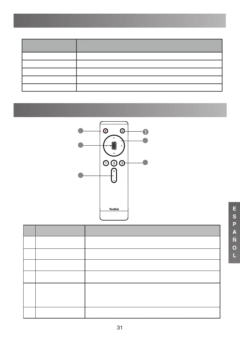 3 Tecla de navegación Inclina y gira la cámara para ajustar el ángulo de visión.