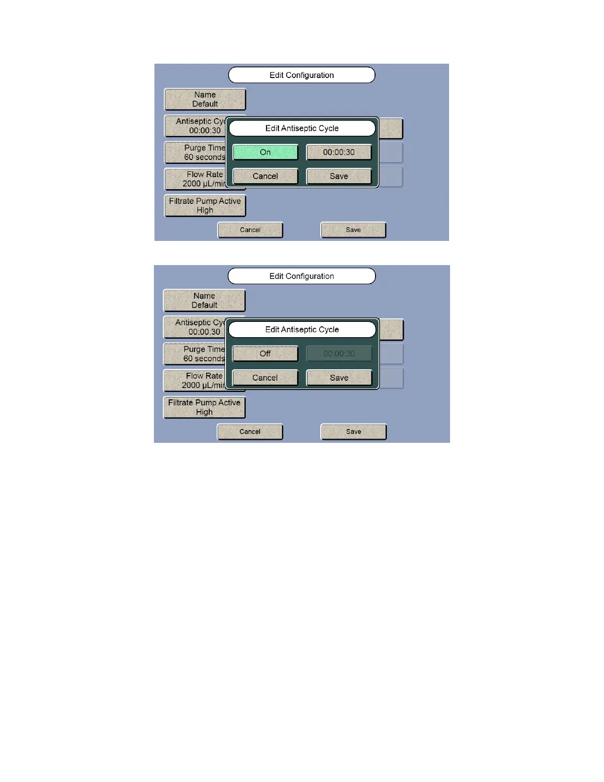 The default filtrate pump output is Active High (+5V). Touch the [Filtrate Pump Active High] button to change it to Active