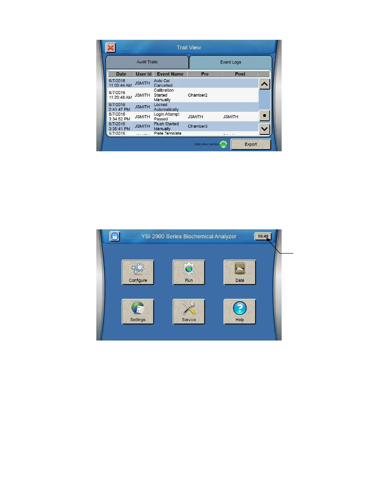 Plug a flash drive into the 2900 Series’ USB port, then touch the [Export] button to send the Audit Trail and Event Log to