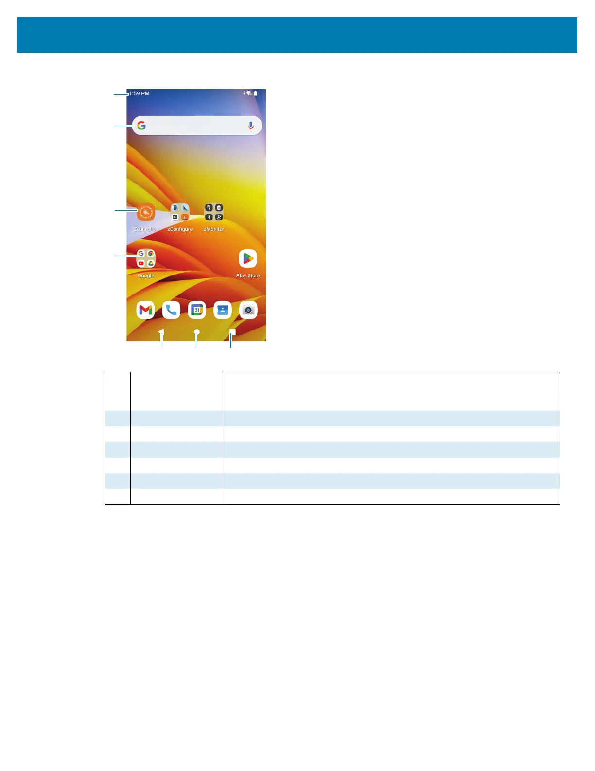 1 Status Bar Displays the time, status icons (right side), and notification icons (left side).