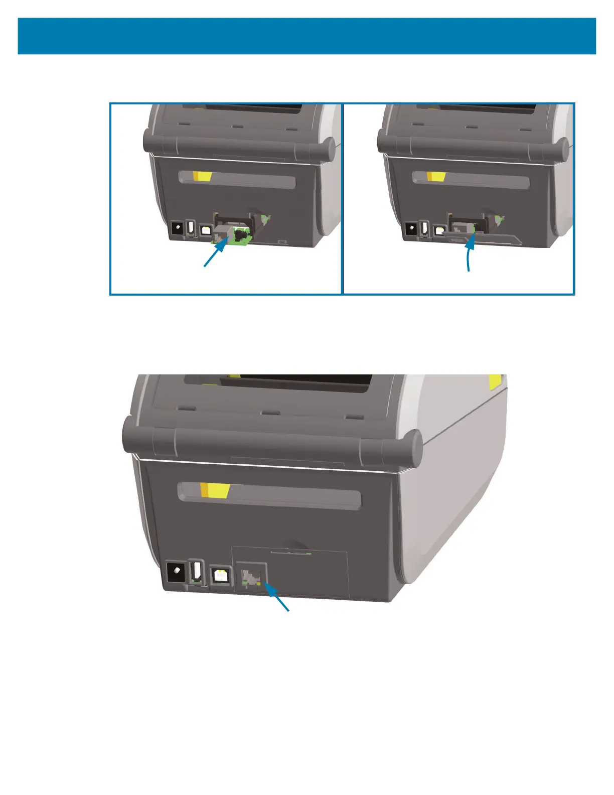 1. With the DC power plug and module’s access door removed, slide the Ethernet module into the printer.