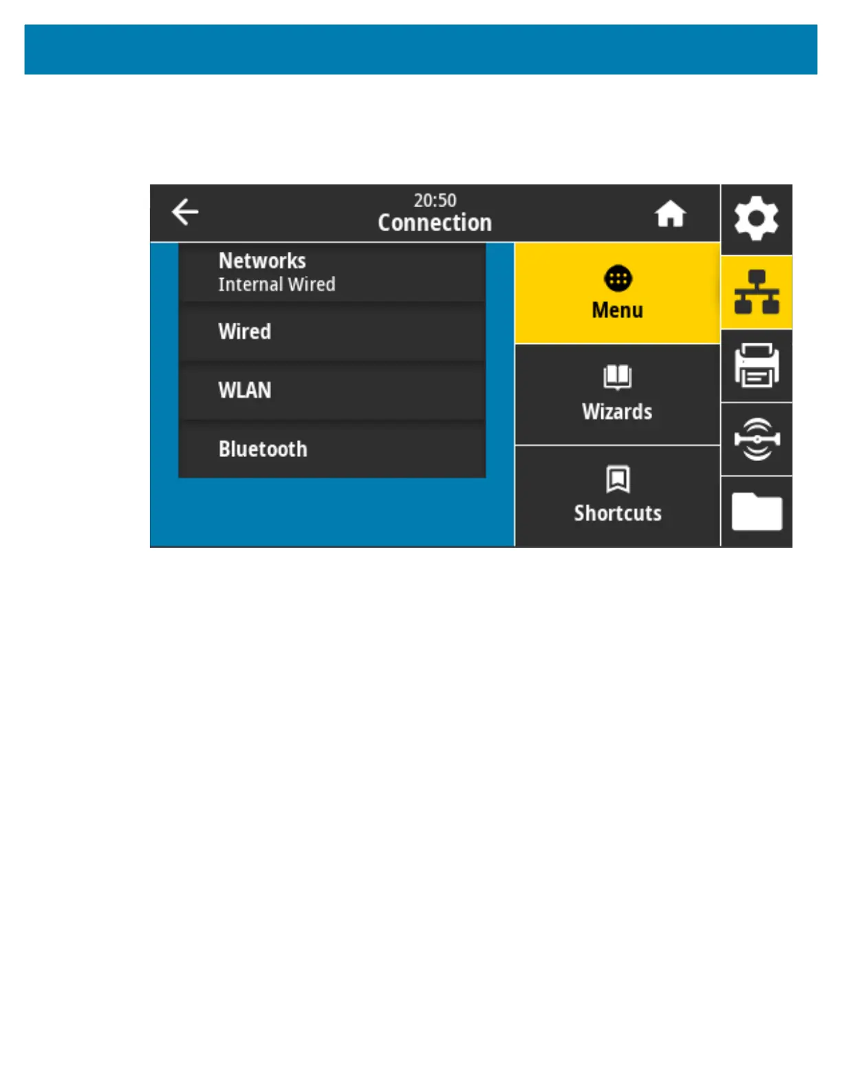Use this menu to set connection parameters for wired and wireless (Wi-Fi and Bluetooth) printer