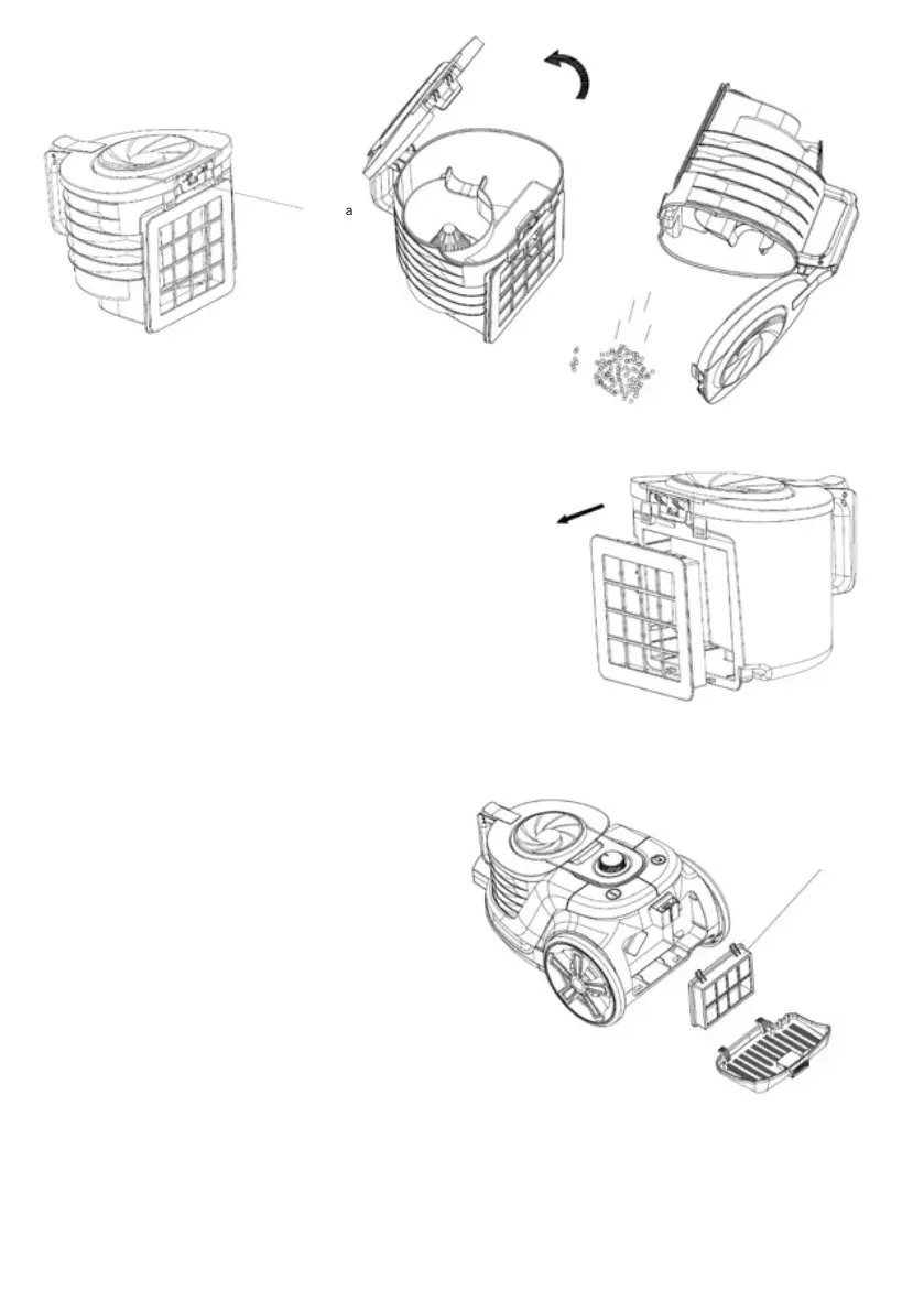 2. Scoateţi recipientul pentru praf şi scoateţi filtrul.